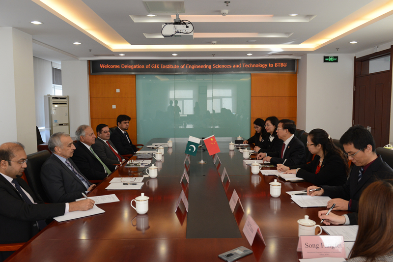 11月10日,巴基斯坦工程科技促會執行主席、GIK工程科技學院董事沙基·杜拉尼先生、GIK工程科技學院校長賈吉汗·巴沙爾先生、大使館教育官員穆罕默德·蘇萊曼先生等一行五人訪問我校。孫寶國校長在阜成路校區會見了代表團一行,會談由國際交流與合作處處長劉影主持。