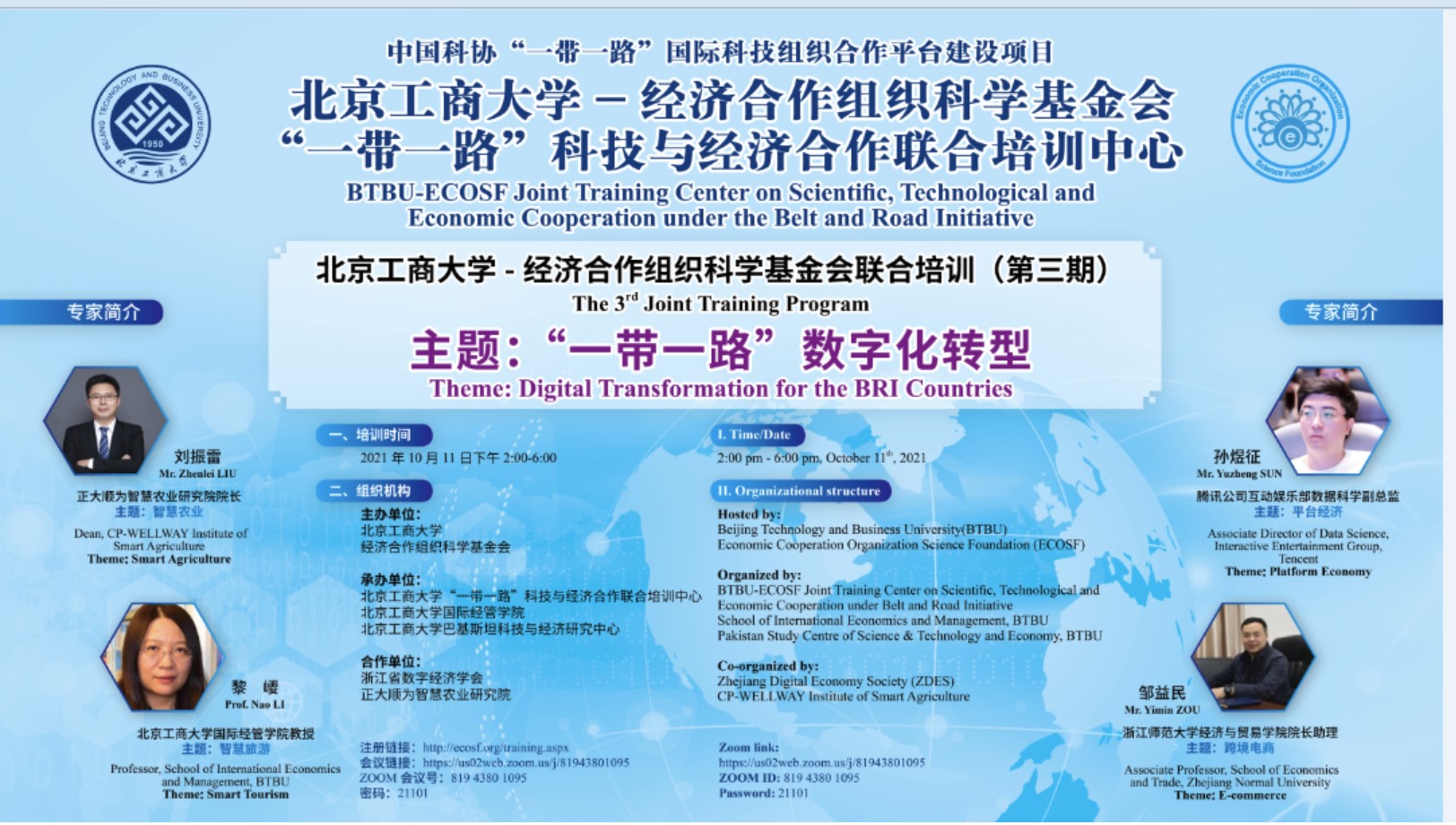 北京工商大學——經濟合作組織科學基金會“一帶一路”科技與經濟合作聯合培訓中心是中國科協“一帶一路”科技組織合作平臺項目資助下成立的國際合作平臺,于2020年9月正式成立。中心旨在通過開展技術應用、產業經濟、科技標準、科學傳播等領域的培訓促進“一帶一路” 國家經濟社會可持續發展。中心已連續組織三期國際培訓,累計培訓國際學員300余人。此次培訓班進一步強化了我校推動國際交流合作的平臺作用,提升了學校服務 “一帶一路”倡議及世界可續發展目標的能力。