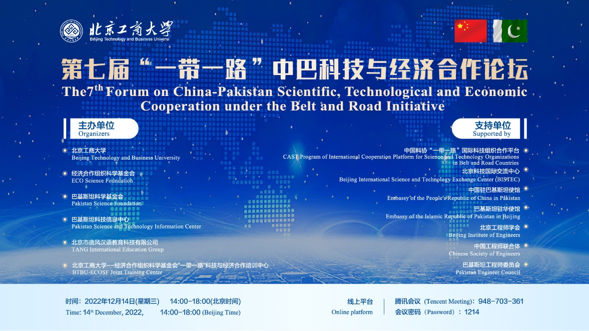 12月14日,在中國科學技術協會國際合作部、北京市科學技術協會、中國駐巴基斯坦大使館、巴基斯坦駐華大使館等單位的大力支持下,我校聯合經濟合作組織科學基金會、巴基斯坦科技與經濟及研究中心、唐風國際教育集團、北京環球英才交流促進會等單位共同舉辦了第七屆“一帶一路”中巴科技與經濟合作論壇。校黨委常委、副校長劉敏華,中國科協國際合作部一級巡視員王慶林,北京市科協黨組成員、副主席、一級巡視員田文,聯合國教科文組織駐華代表處主任夏澤翰,巴基斯坦經濟合作組織科學基金會主席薩義德 ? 科邁爾 ? 塔耶比,巴基斯坦科技信息中心主任阿卡姆·謝赫,巴基斯坦科技部國際合作司副司長汗 ? 穆罕穆德 ? 瓦澤等出席了會議。會議由國際經管學院黨委書記郭毅,我校名譽教授曼佐爾·侯賽因·索洛,巴基斯科技與經濟研究中心執行主任邸玉娜,數字經濟系副主任韓璐共同主持。