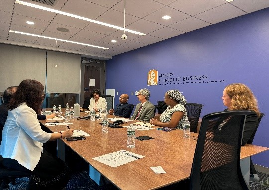 在芝加哥訪問期間,黨委書記黃先開一行先后訪問了美國伊利諾伊大學芝加哥分校和美國多米尼加大學。在伊利諾伊大學芝加哥分校訪問期間,代表團一行與該校國際部舉行項目會談,雙方回顧了2022年雙方建立校級合作關系以來所開展的交流交往以及合作成果,并就下一階段雙方在碩博層次人才培養、高層次師資交流、科研項目合作以及商科數字化教育平臺建設等內容交換了意見,并達成了初步合作意向。隨后,代表團成員在國際部項目主任Jeff Wang的陪同下參觀了校園的相關教學設施。