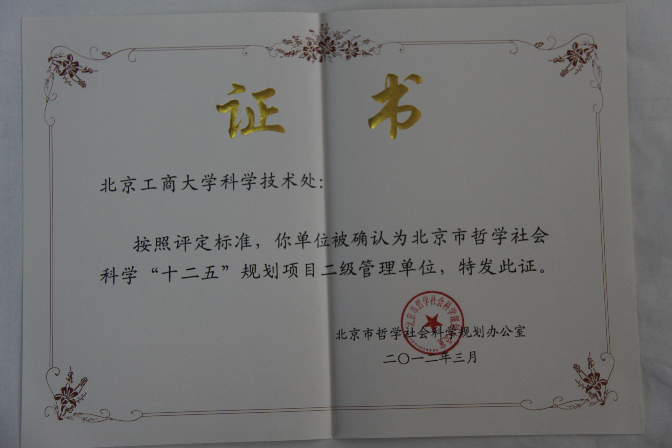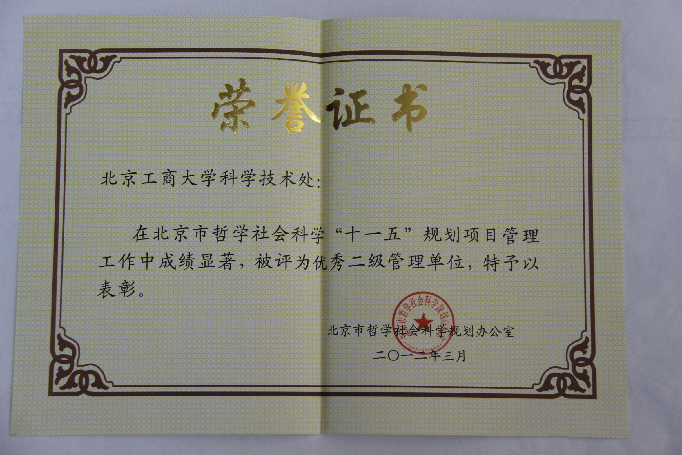 為落實《北京市哲學社會科學規劃項目管理辦法》確定的對市社科規劃項目實行二級管理的要求,為不斷提高二級管理單位的管理水平和履行科研管理職責的積極性、主動性和創造性,將承擔“十一五”規劃項目數在20項以上,項目管理認真、規范,按期結項率和最終研究成果優秀率較高的單位評為優秀二級管理單位。我校科學技術處達到各項標準,獲評優秀二級管理單位,并且按照評定標準,被確認為北京市哲學社會科學“十二五”規劃項目二級管理單位。