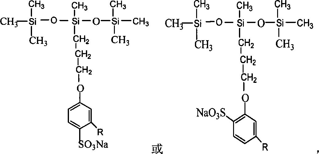 其中,R代表C15H31。 本發明提供了上述的含硅氧烷的腰果酚新型表面活性劑的制備方法。其制備方法是由氯丙基三硅氧烷與生物質腰果酚磺化物反應,然后分離純化可得到含硅氧烷的腰 果酚新型表面活性劑。本發明含硅氧烷的腰果酚新型表面活性劑同時具有含硅表面活性劑和腰果酚表面活性劑的性能特點,具有溶解性好,皮膚刺激性小,生物降解 性優良;并能與其它表面活性劑配伍性好;其表面張力為18-24mN/m。