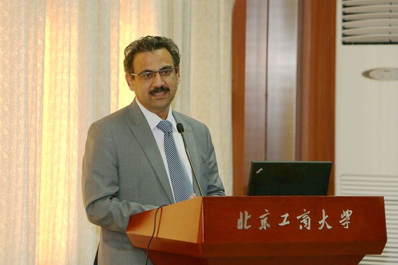 譚向勇在致辭中表示,北京工商大學非常重視與巴基斯坦高校的交流與合作,自2013年以來,共招收巴基斯坦留學生21人。今后學校將積極創(chuàng)造條件,支持巴基斯坦科技與經濟研究中心的建設和發(fā)展,發(fā)揮學校跨學科、跨領域的軟硬件條件,通過一系列優(yōu)勢互補、互利雙贏、務實的合作,為“一帶一路”提供強有力的科技與經濟的咨詢、交流與服務,促進中巴兩國技術轉移,促進民間科技交流,更好地推動兩國創(chuàng)新型和開放型經濟發(fā)展,建設中巴科技、經濟、教育等多領域合作的美好未來。