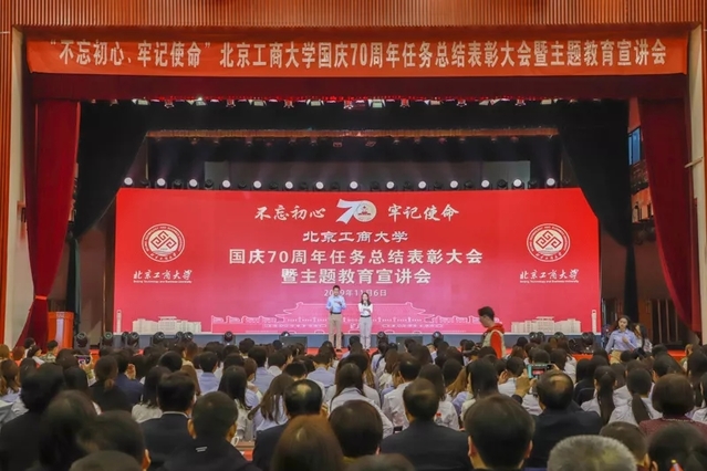 國青年報客戶端訊(中國青年報·中國青年網記者 葉雨婷)11月6日下午,北京工商大學在良鄉校區隆重舉行“不忘初心、牢記使命”國慶70周年任務總結表彰大會暨主題教育宣講會。國慶任務參與人員和服務保障人員、師生代表2000余人參加大會。