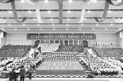 為慶祝建黨90周年,北京工商大學(xué)日前舉行千人大合唱歌詠比賽,比賽同時也是該校第十一屆藝術(shù)節(jié)閉幕式,全校兩千多名師生參加。