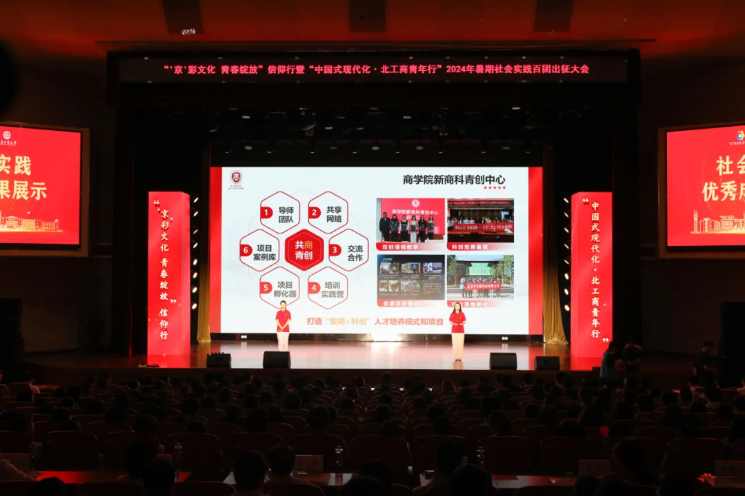 學校黨委書記黃先開,市社科院黨組成員、副院長、市委講師團團長肖峻峰,市委教育工委宣教處副處長丁貞棟,市委宣傳部理論處許倩,團市委大學部副部長王曉鷗一同上臺,共同啟動2024年“‘京’彩文化 青春綻放”信仰行暨“中國式現(xiàn)代化 北工商青年行”暑期社會實踐百團出征!