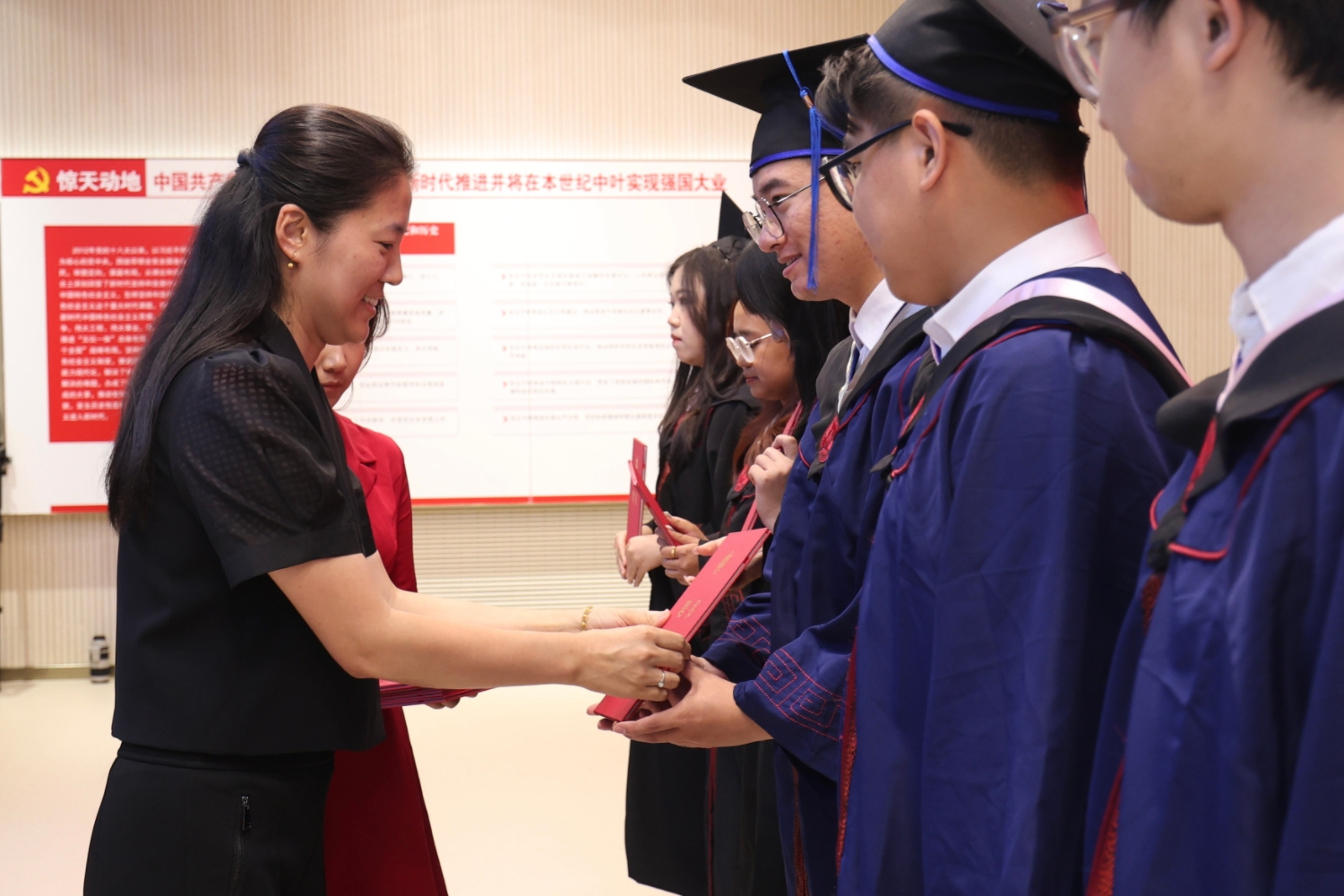 畢業(yè)生們依次上臺(tái),執(zhí)行院長(zhǎng)曹顯兵為畢業(yè)生撥流蘇,黨委書記周艷杰為畢業(yè)生頒發(fā)畢業(yè)證及學(xué)位證。