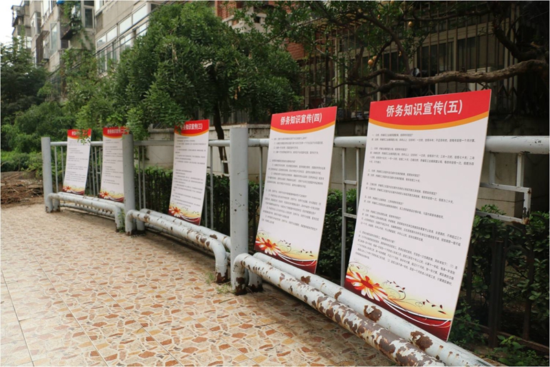 學(xué)生志愿者走進(jìn)皇亭子社區(qū),放置了由團(tuán)隊(duì)成員提前做好的“僑務(wù)知識(shí)”宣傳展板,同時(shí)三兩一組發(fā)放《為僑服務(wù)便民卡》和《中華人民共和國歸僑僑眷權(quán)益保護(hù)辦法》,使社區(qū)居民進(jìn)一步了解到國家法律對(duì)歸僑僑眷的保護(hù),同時(shí)加強(qiáng)了學(xué)生服務(wù)團(tuán)隊(duì)新成員對(duì)活動(dòng)的深入認(rèn)知。