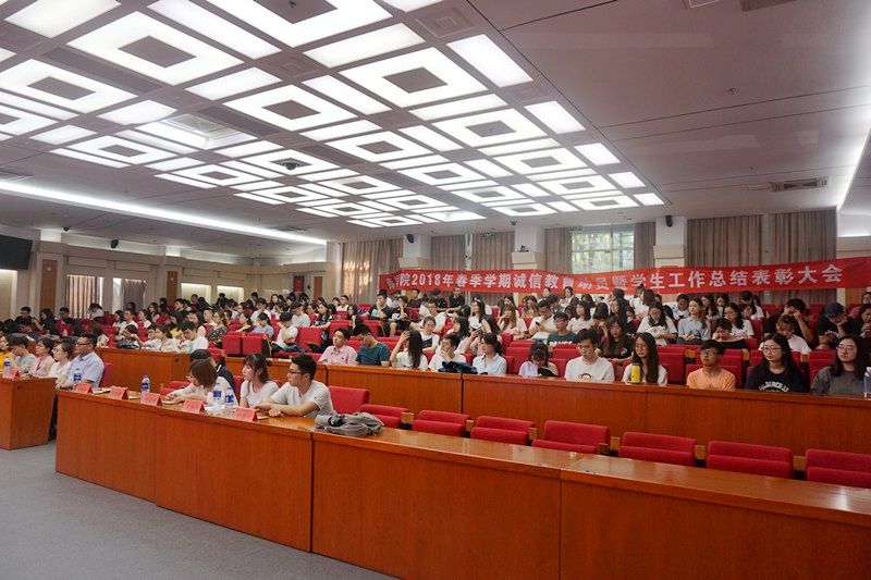 為迎接即將到來的期末考試,不斷完善提高共青團、學生會、青志協的工作水平,激勵商學院學生積極奮進勇往直前,商學院于6月20日下午開了2018年春季學期誠信教育暨學生工作總結表彰大會。學院黨委副書記樊江濤、團委書記李艷春、常務副書記李璐和郭建榮、李雨晴兩位輔導員,與學生組織系統主要干部、各班主要負責人近300人一起參加了大會。
