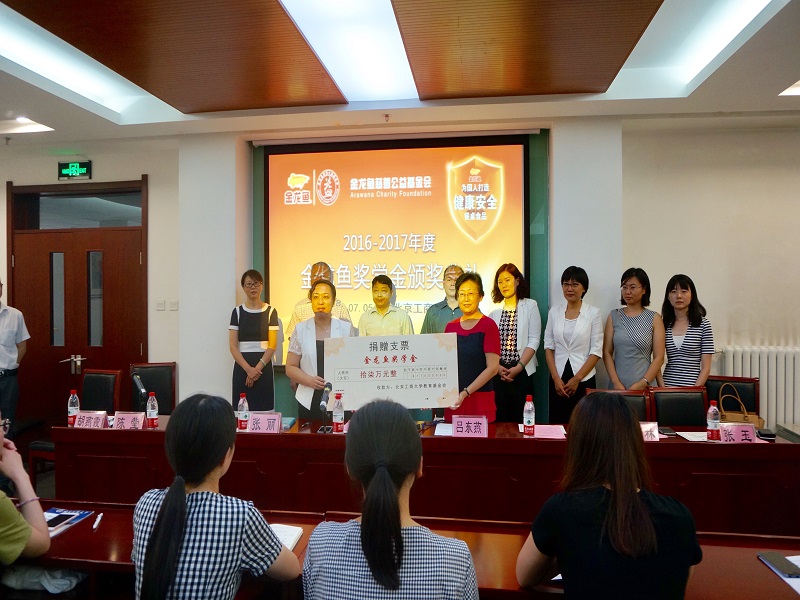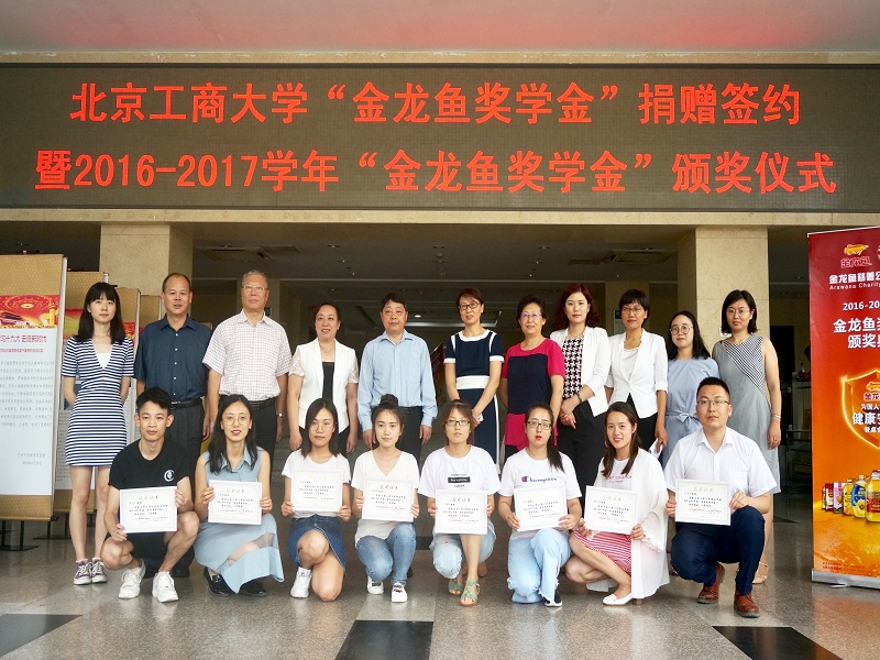 75日,北京工商大學“金龍魚獎學金”捐贈簽約暨首屆“金龍魚獎學金”頒獎儀式在阜成路校區舉行。益海嘉里集團研發中心總監徐學兵、公共事務部高級經理張麗、研發中心專業副總監陳瑩、北京管理中心人事行政經理張玉及工作人員、我校校友會(教育基金會)秘書長呂東燕、食品學院黨委書記何猛、學生處副處長、就業指導中心主任楊林、輔導員、獲獎學生代表及七十余名研究生參加了儀式。儀式由食品學院黨委副書記胡燕霞主持。