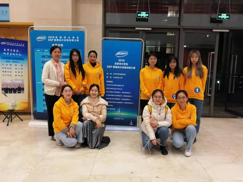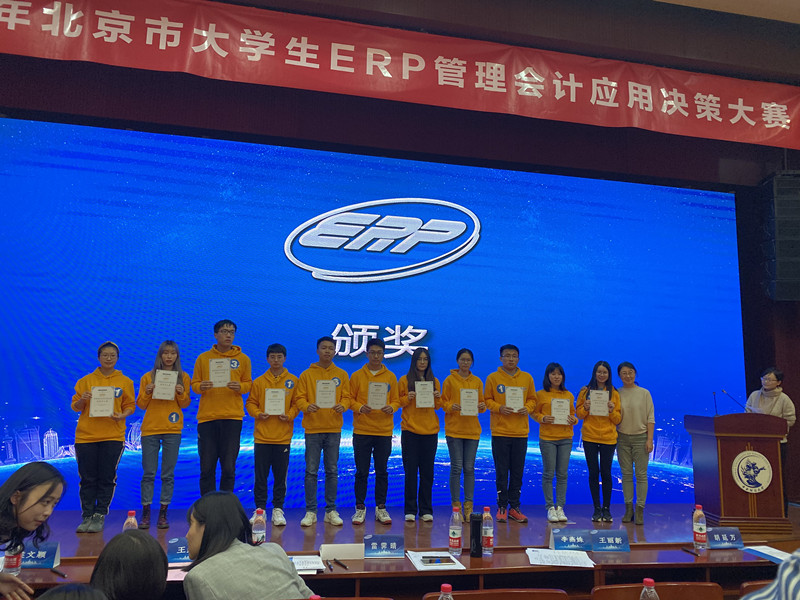 2019年北京市大學生ERP管理會計應用決策大賽由北京市教育委員會主辦、中央財經大學承辦,是北京市首個官方性質的經管類學科競賽,共有來自北京市27所高校的691支隊伍報名參賽,我校共有5支隊伍進入總決賽。總決賽包括ERP管理會計決策應用和經營成果展示兩個環節。在決策應用階段,每支隊伍的4名成員分飾不同角色,分工協作,分別完成年度目標制度分解、年度預算編制、一二季度預算執行、預算分析與調整、三四季度預算執行、預算考核等環節,將學到的管理會計、財務會計、管理學等知識綜合運用到商業場景中,并根據商業環境隨機應變,展現了過硬的專業素質。