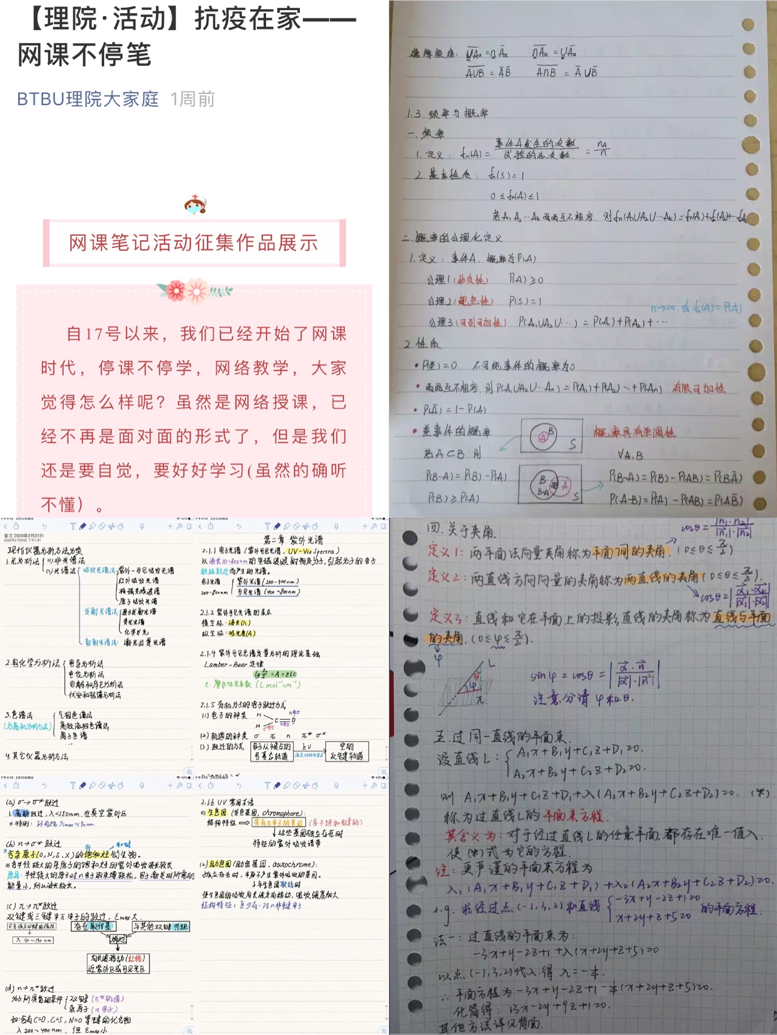 突發的疫情打亂了我們正常的學習和生活,宅家抗“疫”最終成了唯一的選擇。為落實學校“停課不停學”的要求,同時為同學們的宅家抗“疫”生活增添一些樂趣,學院開展了“抗疫在家——網課不停筆”活動,將優秀的筆記在學院微信公眾號上展出,激發同學們養成認真、工整記筆記的良好學習習慣,同時可以使同學們互相交流學習,促進共同進步。
