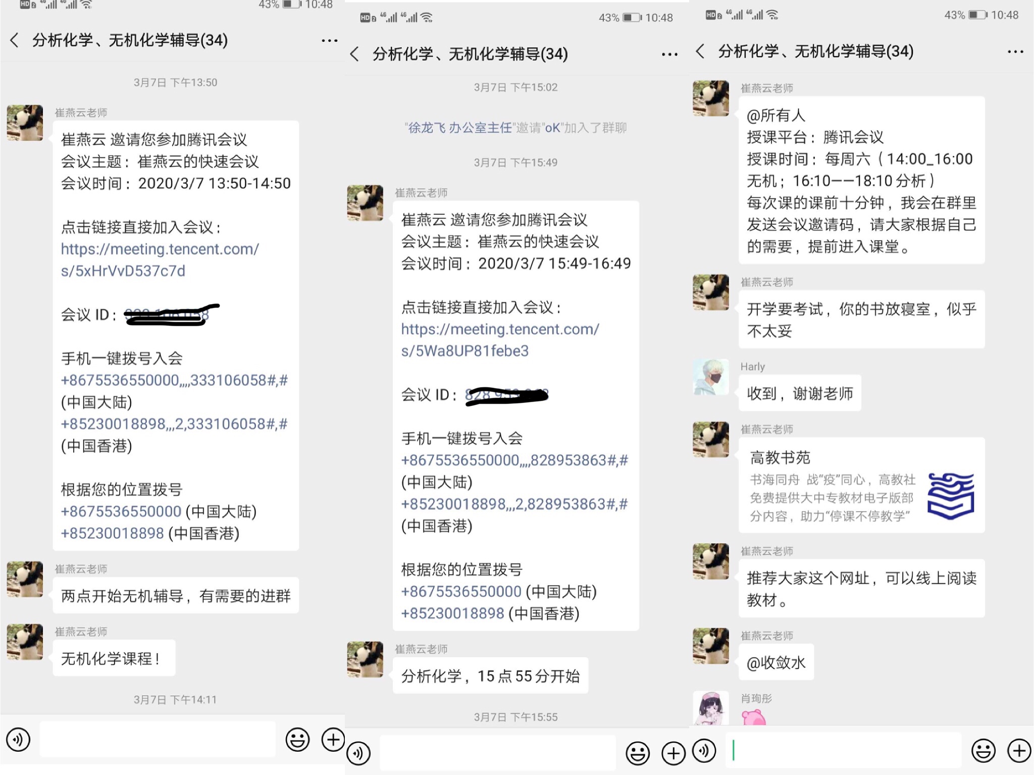 針對學院部分19級學生高中階段未學習化學相關課程,或化學基礎薄弱的情況,學院上學期安排化學系崔燕云老師對學生進行了課程輔導。近期針對上學期化學課程考試掛科的學生,學院再次安排化學系崔燕云老師為他們進行線上輔導。輔導員幫助建立了化學課答疑輔導微信群,幫助化學課程掛科和化學基礎薄弱的同學學習。為了幫助更多的學生解決學業問題,學院還邀請了18級和17級未通過分析化學和無機化學考試的同學也進群學習。崔老師通過騰訊課堂每周兩次講授相關課程,并隨時在微信群里為同學們答疑解惑,受到同學們的好評。