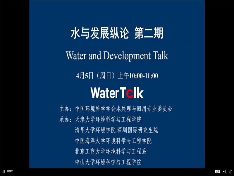 4月5日,第2期“水與發(fā)展縱論(WaterTalk)”以網(wǎng)絡(luò)會議形式舉行。生態(tài)環(huán)境部環(huán)境規(guī)劃院院長、中國工程院院士王金南院士作學(xué)術(shù)報(bào)告,清華大學(xué)環(huán)境學(xué)院教授、水處理與回用專業(yè)委員會主任胡洪營主持論壇。本次會議由中國環(huán)境科學(xué)學(xué)會水處理與回用專業(yè)委員會主辦、我校環(huán)境科學(xué)與工程系與天津大學(xué)環(huán)境科學(xué)與工程學(xué)院、清華大學(xué)環(huán)境學(xué)院和深圳國際研究生院、中國海洋大學(xué)環(huán)境科學(xué)與工程學(xué)院、中山大學(xué)環(huán)境科學(xué)與工程學(xué)院等單位聯(lián)合承辦。