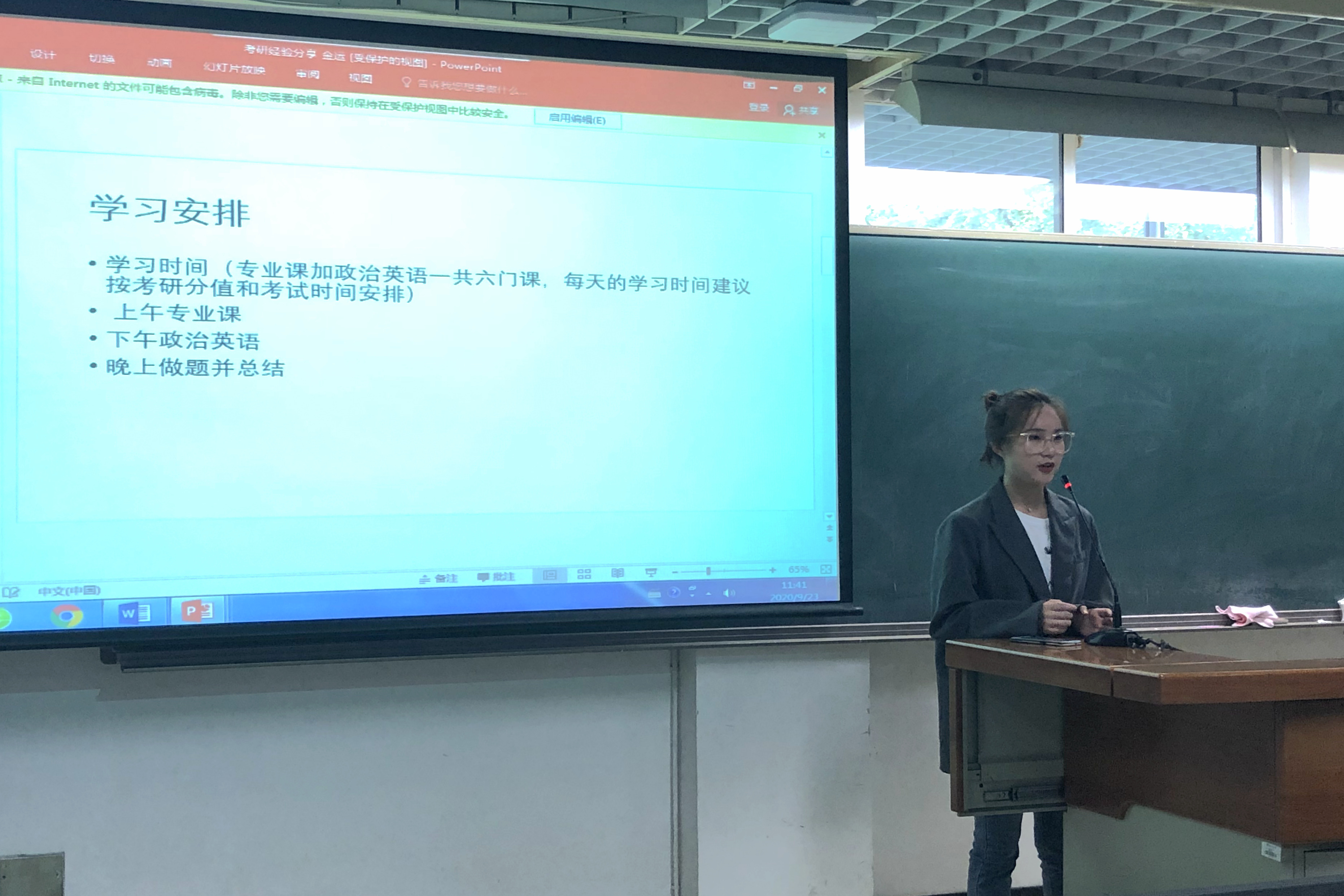 隨后,金運、劉文瑾、李新宇三位同學作為畢業生代表,分別向在場同學分享了她們各自的備考經歷。李新宇從政治、英語、專業課以及擇校四個方面,向同學們分享了她的備考經驗以及心路歷程。而金運和劉文瑾則分別從訴訟法和民商法的專業角度出發,為同學們詳細介紹了研究生階段的發展方向以及他們各自的感受。