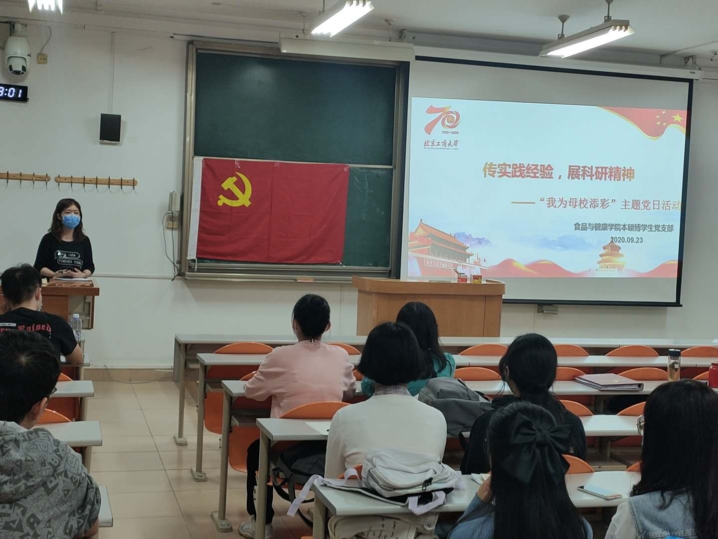 9月23日晚,食品與健康學(xué)院本碩博各學(xué)生黨支部聯(lián)合開展了以“傳實(shí)踐經(jīng)驗(yàn),展科研精神——我為母校添彩”為主題的黨日活動。此次活動由食品科學(xué)與工程本科生黨支部書記李欣萍主持。