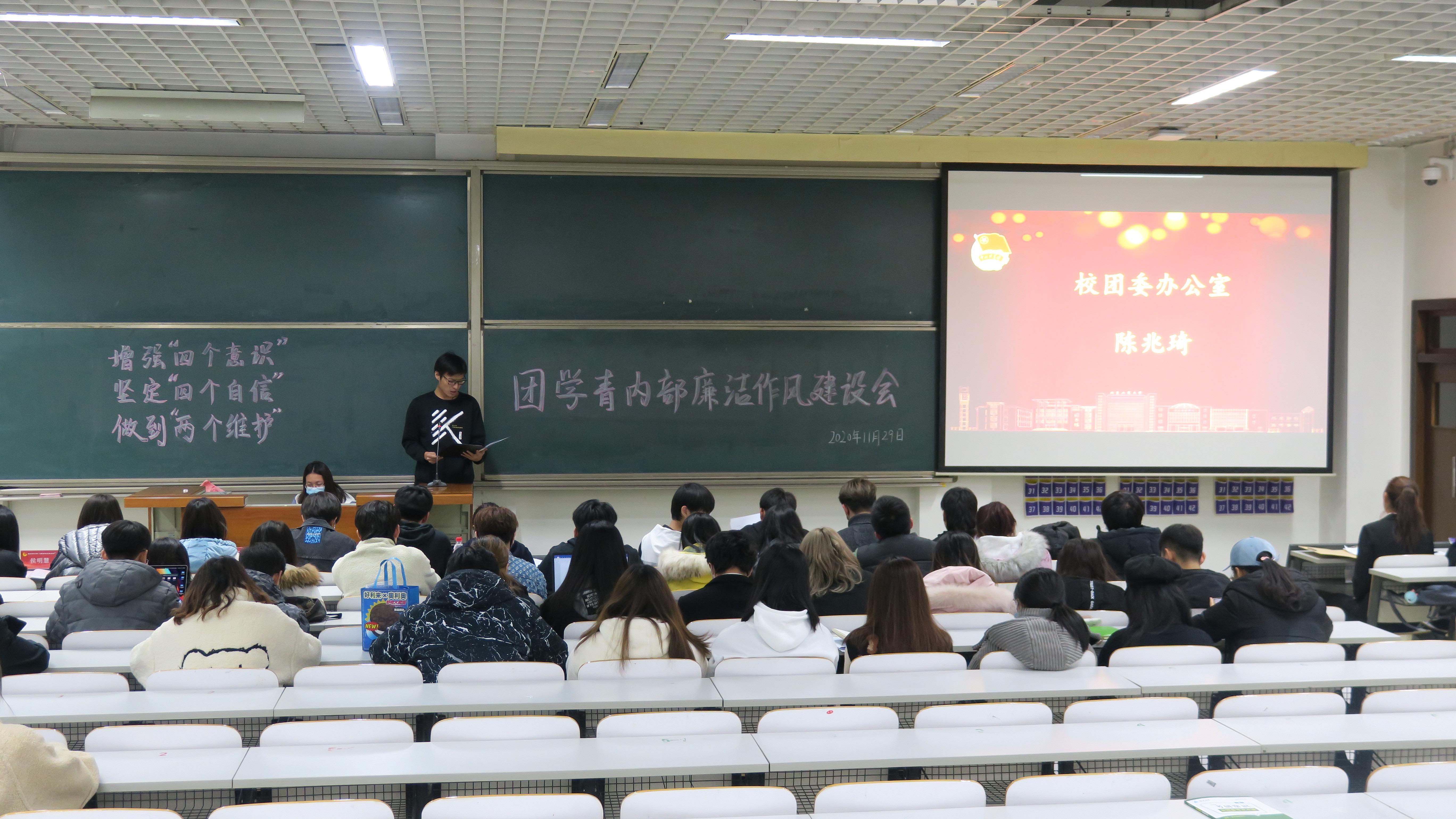 11月29日晚,我校團委學生組織廉潔作風建設會在良鄉(xiāng)校區(qū)舉行。校團委老師、團委學生各部門、學生會、青年志愿者協(xié)會主要學生干部共四十余名成員參加了本次會議。