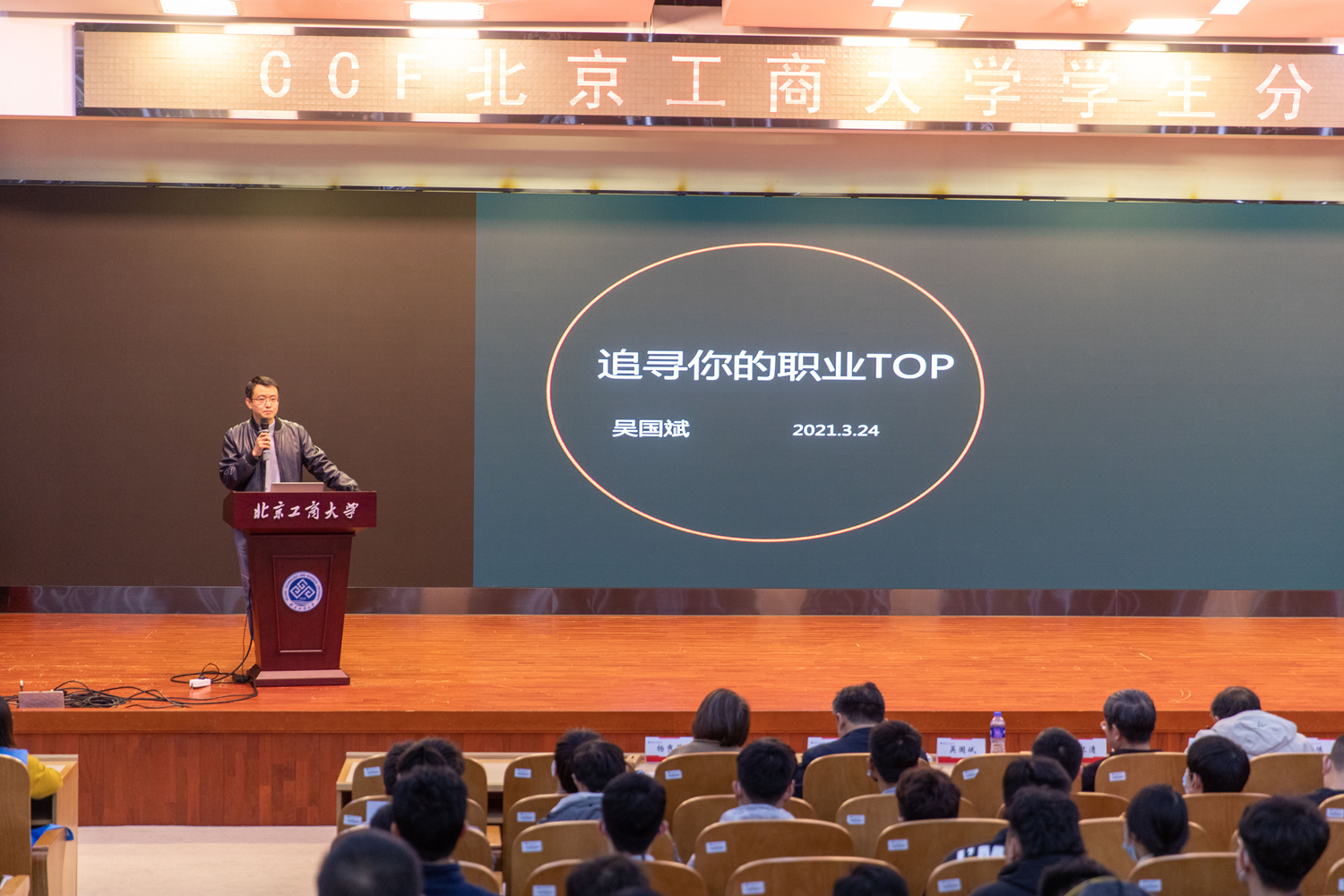 3月24日下午,計(jì)算機(jī)學(xué)院在良鄉(xiāng)校區(qū)舉辦中國(guó)計(jì)算機(jī)學(xué)會(huì)(CCF)北京工商大學(xué)學(xué)生分會(huì)“學(xué)習(xí)與職業(yè)生涯規(guī)劃”專題活動(dòng)。CCF(中國(guó)計(jì)算機(jī)學(xué)會(huì),以下簡(jiǎn)稱CCF)秘書長(zhǎng)、中科院計(jì)算所研究員、博士生導(dǎo)師唐衛(wèi)清博士,CCF會(huì)員與分部工作委員會(huì)主任、滴滴出行科技生態(tài)與發(fā)展總監(jiān)吳國(guó)斌博士到現(xiàn)場(chǎng)作專題報(bào)告。我校黨委書記黃先開出席活動(dòng),計(jì)算機(jī)學(xué)院黨委書記蔡強(qiáng),執(zhí)行院長(zhǎng)李海生,CCF北京工商大學(xué)學(xué)生分會(huì)指導(dǎo)委員會(huì)主任陳誼,學(xué)院副院長(zhǎng)譚勵(lì)、劉瑞軍,副書記楊秀萍,以及計(jì)算機(jī)學(xué)院本科和研究生200余人參加了本次活動(dòng)。活動(dòng)由CCF北京工商大學(xué)學(xué)生分會(huì)主席梁義珂主持。
