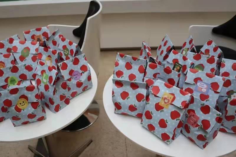 紅彤彤的蘋果,每一個都承載著同學們真切的祝愿。每個收到小禮袋的考研學子都會發自內心的露出微笑并輕聲道謝,繼而邁著更堅定的腳步離去。劉同學從開學初就投入到了復習考研的大軍中,當他收到學院為他們綠色通道的學生專門準備了考研祝福禮物的通知時,他一大早就來到了商樓,他說這是自他決心考研后,第一次切切實實的感受到自己并不孤獨,也不是在孤軍奮戰。正如他所言,這些追夢人身后是學院的老師同學作為最堅強的后盾。千言萬語的祝福被放進小小的禮物袋里,陪著他們大步向前。