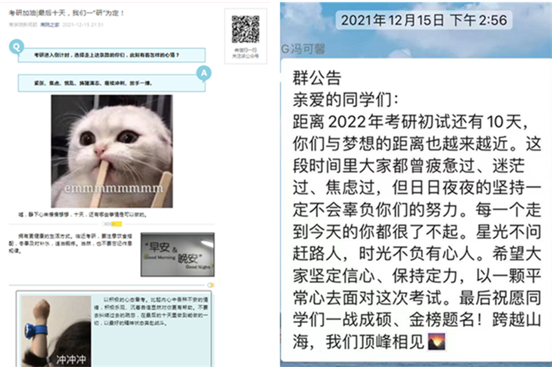 與此同時,商學院也通過年級輔導員為考研學子發送溫馨提醒的短信給他們加油鼓勁;學院通過“商院之家”微信公眾號推出提醒和祝福,為考研的學生送出最堅實的支持。希望商院考研學子在邁向新的人生階段階梯的路上,要相信拼搏奮斗在圖書館的時光,都會化為黎明的第一縷光,點亮未來!