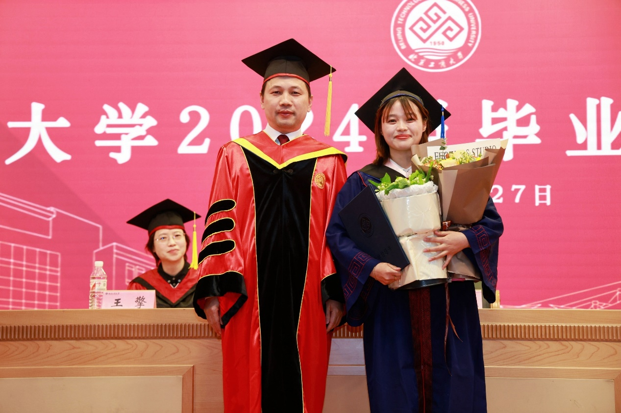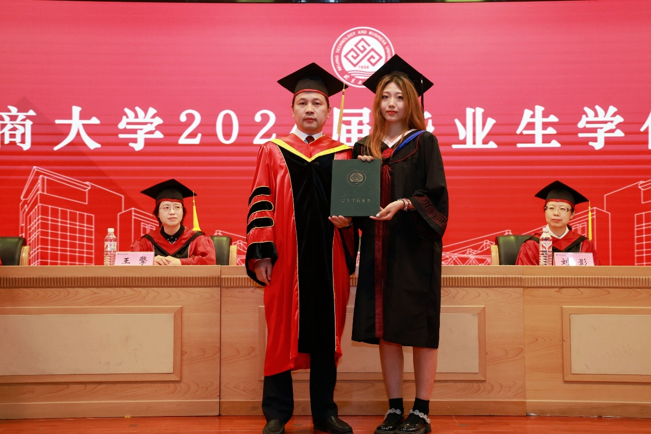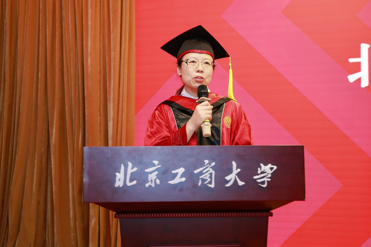 寇紅江代表學校向全體畢業生和畢業生家長表示最熱烈的祝賀和最美好的祝愿。他表示,過去的幾年里各位青年學子與學校一同成長,共同見證了學校的蒸蒸日上,同學們在學術探索上追求卓越,勇攀高峰;在社會服務中錘煉品格,磨礪意志;在團隊拼搏中學會合作,攜手成長;在逐漸成熟中感悟人生,學會感恩。同學們用自己的青春和熱情,為學校和學院注入了無限的活力,也為父母和家庭帶來了蓬勃的希望。寇紅江叮囑畢業生要不忘初心使命,在未來的道路上不斷實踐,成為國之棟梁。他告訴畢業生們,畢業不是結束而是新的起點,北京工商大學永遠是同學們的溫暖港灣和堅強后盾,歡迎常回家看看。