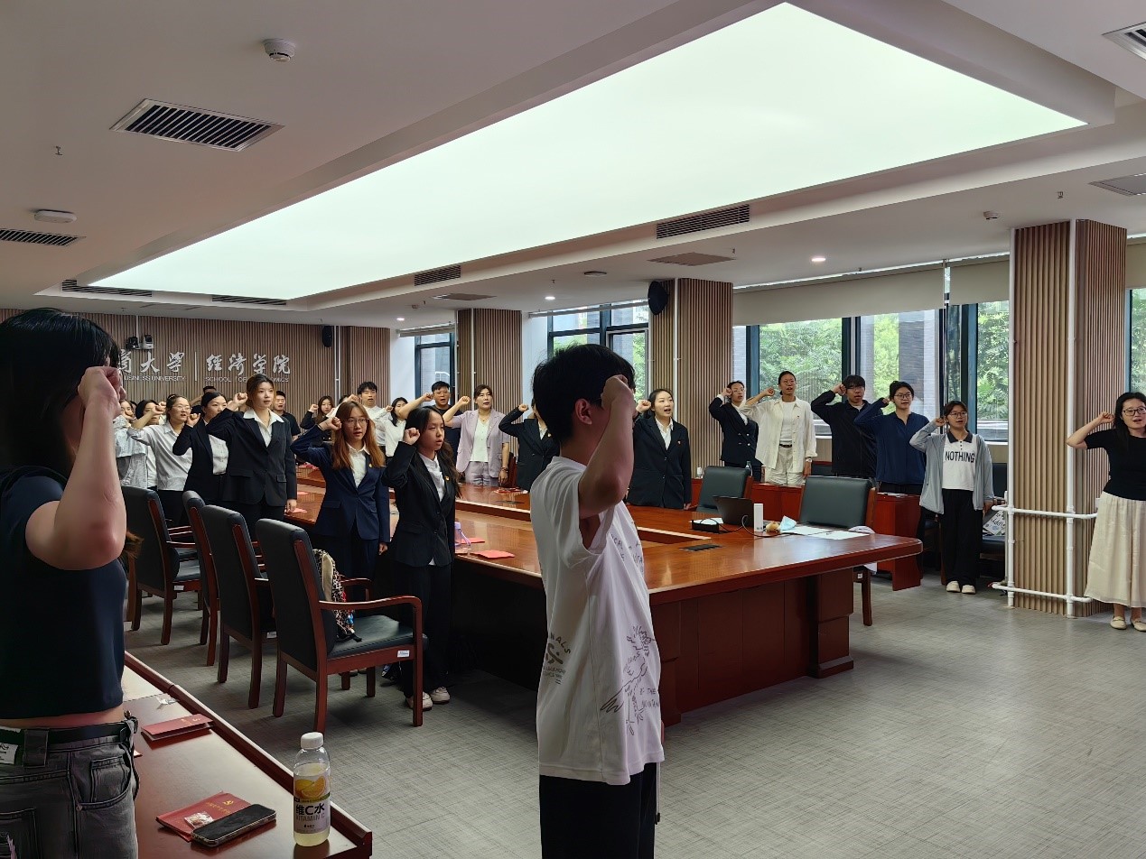 為慶祝中國共產黨成立104周年,深入貫徹中央八項規定精神,進一步提高政治站位,深刻認識持續深化作風建設的重要意義,通過莊嚴的儀式教育筑牢學生黨員思想根基,不斷增強政治判斷力、政治領悟力、政治執行力,7月1日,經濟學院舉行2025年春季學期新發展黨員“第一堂黨課”暨集體宣誓儀式。經濟學院黨委副書記李艷春、專職組織員柳金龍、本科生黨建專項輔導員李文靜及春季學期新發展本研學生黨員46名參會。會議由本科生黨建專項輔導員李文靜主持。