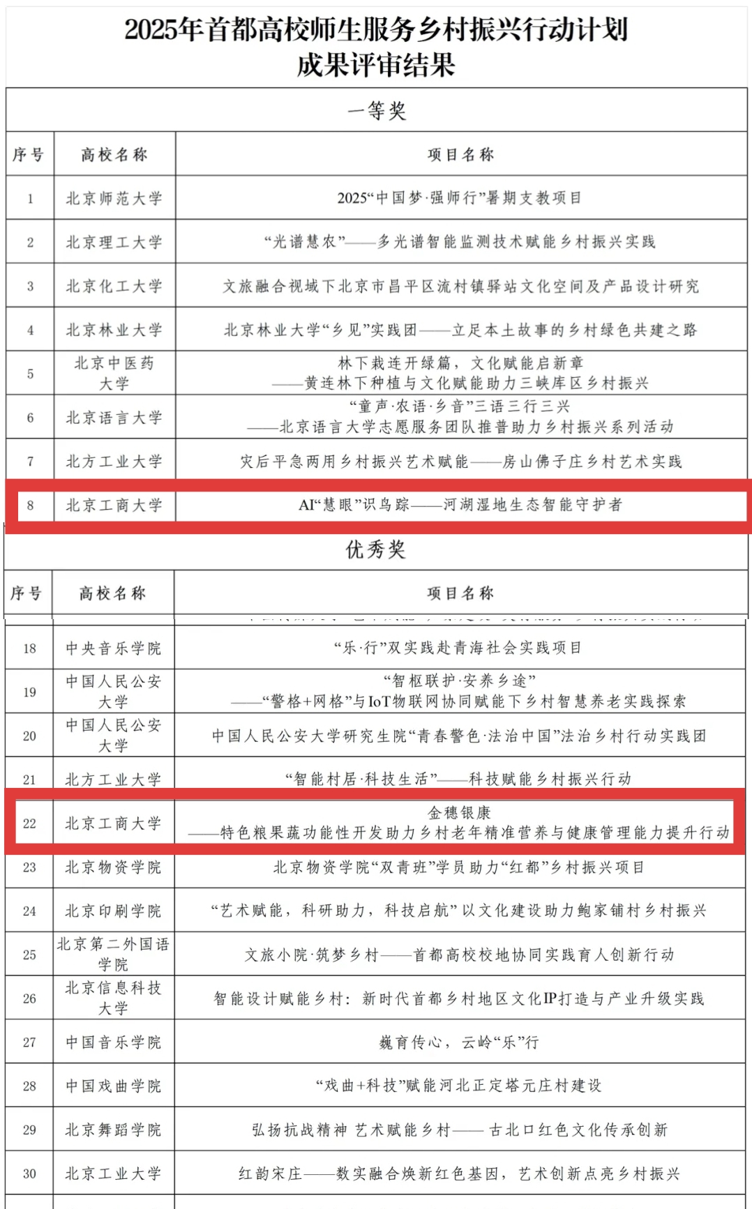 近日,北京市思想政治工作中心公布了2025年首都高校師生服務(wù)鄉(xiāng)村振興行動(dòng)計(jì)劃成果評審結(jié)果。由市委教育工委、市教委近期組織專家對100支立項(xiàng)團(tuán)隊(duì)進(jìn)行成果評審,共評選出一等獎(jiǎng)10項(xiàng)、二等獎(jiǎng)20項(xiàng)、三等獎(jiǎng)30項(xiàng)、優(yōu)秀獎(jiǎng)40項(xiàng)。我校計(jì)算機(jī)與人工智能學(xué)院的《AI“慧眼”識鳥蹤——河湖濕地生態(tài)智能守護(hù)者》項(xiàng)目憑借其前瞻性的技術(shù)應(yīng)用和顯著的生態(tài)效益,脫穎而出,榮獲一等獎(jiǎng);食品與健康學(xué)院的《金穗銀康——特色糧果蔬功能性開發(fā)助力鄉(xiāng)村老年精準(zhǔn)營養(yǎng)與健康管理能力提升行動(dòng)》項(xiàng)目也因其在改善民生方面的突出貢獻(xiàn),榮獲優(yōu)秀獎(jiǎng)。