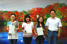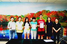 近日,2014年全國大學(xué)生英語競(jìng)賽(NECCS)成績揭曉,我校榮獲全國一等獎(jiǎng)4人,二等獎(jiǎng)10人,三等獎(jiǎng)22人。其中,來自商學(xué)院的肖筱童、曹蘭心、李夢(mèng)遠(yuǎn)和董子晰同學(xué)獲得一等獎(jiǎng)。9月11日,外國語學(xué)院副院長苗天順及部分指導(dǎo)老師為獲獎(jiǎng)同學(xué)頒發(fā)了證書。