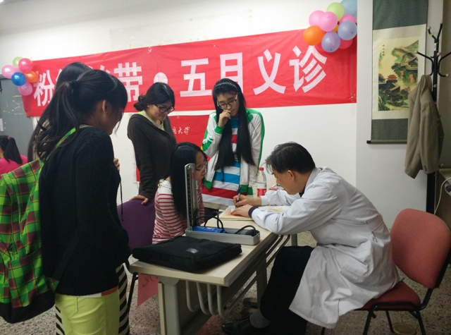5月12日、13日,校研會青志協舉辦了以“粉紅絲帶·五月關愛”為主題的系列活動。活動共分為乳房健康知識宣傳和健康義診兩部分。 在活動宣傳中,來咨詢的同學絡繹不絕,工作人員一邊分發宣傳手冊,一邊指導報名參加義診活動。同學們很積極,紛紛前來報名咨詢,大家的熱情還吸引了來自哈薩克斯坦和非洲地區的朋友。宣傳結束后,協會成員還專門為打印店、小賣部、書店的阿姨和樓管阿姨送去了義診邀請。每天都為學業生活忙碌的我們,有機會也不要忘記停下腳步多多關心自己的身體。 義診現場,邀請到了海軍總醫院王海龍主任、李易霞主任和校醫院王彤醫生為我校師生進行女性健康義診。三位醫生很耐心地微笑傾聽并回答了前來看診的每一個同學的問題。醫生們的熱心和真誠令大家感動,在短短的三個小時里就有84位同學前來咨詢問診,同學們對我們本次義診活動相當滿意,并夸贊說很用心很有意義。 本次活動秉著青志協“讓志愿融入生活”的理念宗旨,不僅鼓勵全校師生多多關注身體健康,更是用實際行動展現了奉獻、友愛的志愿者精神,激發了同學們從事公益的熱情和積極性。