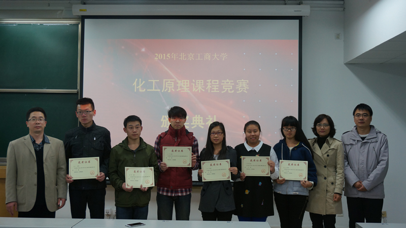 由我校教務處主辦、食品學院承辦的2015年北京工商大學首屆《化工原理》課程競賽于2015年6月成功舉行。來自食品學院和材機學院的110余位同學參加了競賽,經初賽、決賽,評出一等獎6名,二等獎10名,三等獎18名,優秀獎21名。