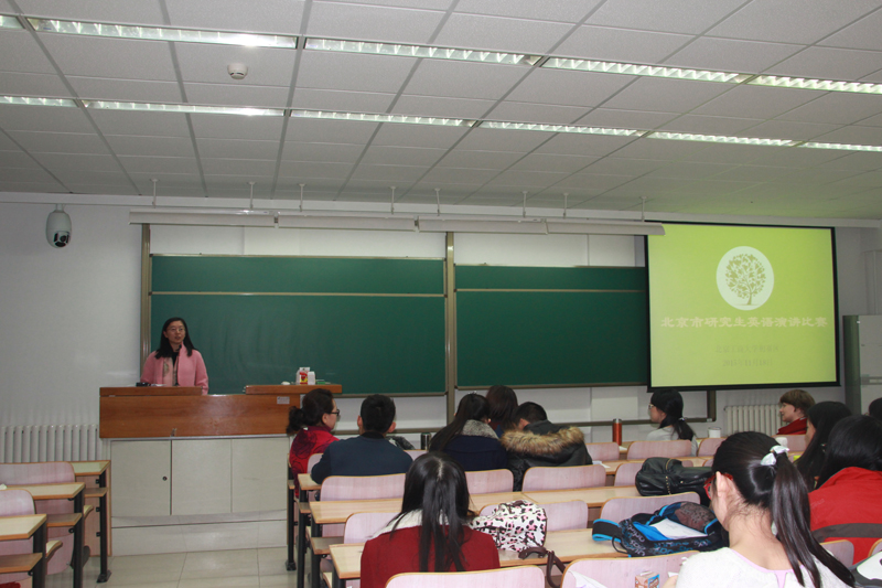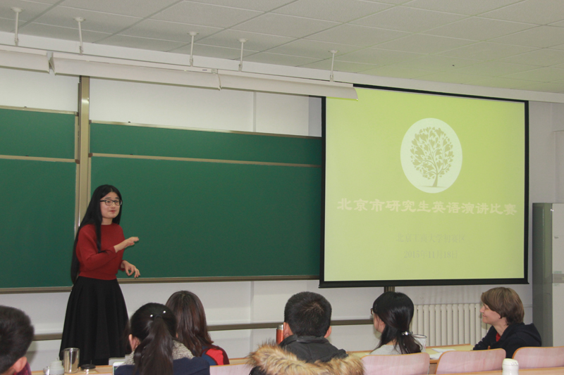 為提高我校研究生的英語口語水平,增強(qiáng)全校研究生的英語學(xué)習(xí)氛圍,在研究生院的大力支持和配合下,由外國語學(xué)院主辦的“北京工商大學(xué)第二屆研究生英語演講比賽”于11月18日下午在阜成路校區(qū)舉行。外國語學(xué)院的張艷華、趙聃、田芳和Kerryn等老師擔(dān)任了本次比賽的評委。