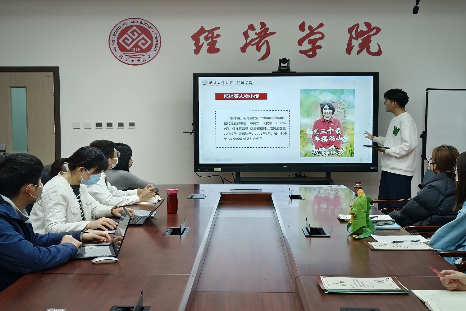 經濟學院金融22級黨支部書記隋江鋒同志從鄉村振興微故事、普惠金融對鄉村振興和共同富裕的促進以及青年在推進共同富裕中的責任與擔當三個方面做出主題為 “聚焦二十大 看鄉村振興 話共同富?!钡膶n}匯報。首先通過視頻短片方式向大家介紹了帶領廟荒村黨員群眾一起譜寫村子壯麗發展新篇章的河南省安陽市林州市黃華鎮黨支部書記郁林英同志的鄉村振興故事。隨后解釋了共同富裕與鄉村振興之間的內在關系,并結合自身學科知識對普惠金融促進共同富裕機理進行分析。最后,隋江鋒同志對推進共同富裕做出了作為新時代青年黨員的理解,他認為打江山容易守江山難,青年黨員要明確自己在推進共同富裕中的責任與擔當,志存高遠,應腳踏實地,應開拓創新,順應時代要求,尋找更好地解決問題的思路。
