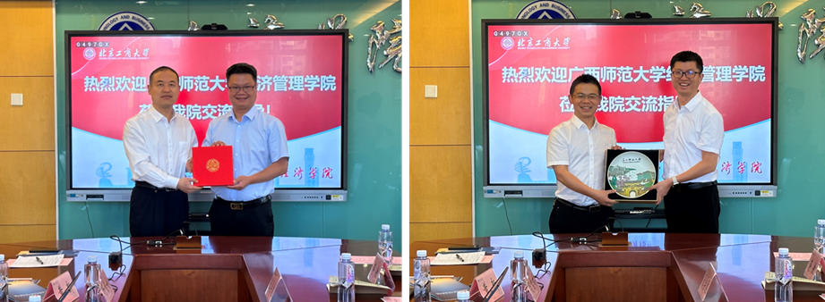 詹新宇熱忱歡迎廣西師范大學經管學院領導班子的蒞臨指導,介紹了北京工商大學經濟學院發展歷程、學科建設、師資隊伍、人才培養等方面情況,并分享了“一個目標,三大重點,七項舉措”學院學科建設整體思路。張海豐感謝經濟學院的熱情接待,主要介紹了廣西師范大學經濟管理學院歷史沿革、學科建設、人才培養等基本情況,并分享了國際認證的相關經驗。