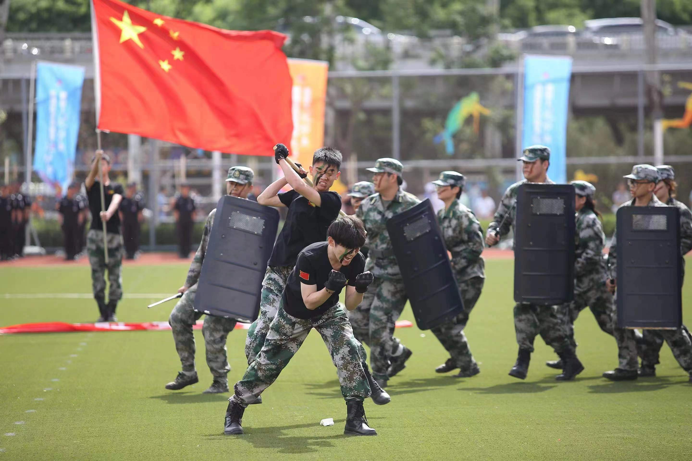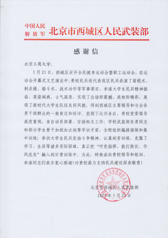 5月21日,北京市西城區(qū)全民健身運動會在月壇體育中心隆重舉行。在開幕式文藝演出環(huán)節(jié),我校大學(xué)生民兵連代表西城區(qū)武裝部民兵組織表演軍事科目《民兵風(fēng)采》燃爆全場。西城區(qū)領(lǐng)導(dǎo)給予高度評價,西城區(qū)武裝部給學(xué)校發(fā)來感謝信。