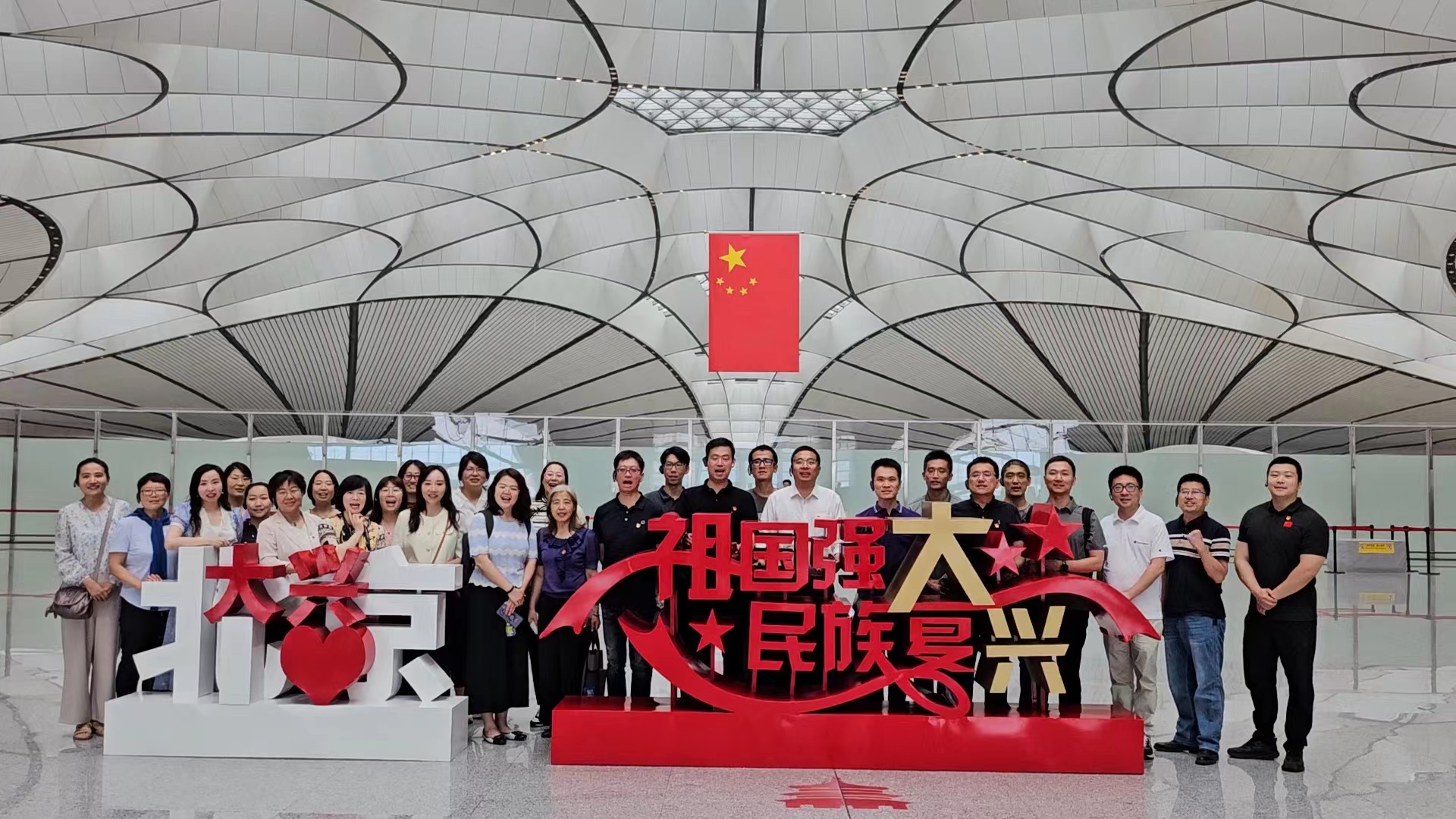 通過參觀走訪,每一名參加活動的黨員切實感受到了中國智慧和中國力量。大型儀器設備共享中心黨員王晨萌談到,近半年幾次在大興國際機場出行,航站樓采用五指廊構型,雙層出發設計,從航站樓中心到最遠端登機口步行時間不超過8分鐘,為全球首創,比傳統方式提高四倍,讓旅客充分感受到了高質高效的服務。機場內充滿文化底蘊和設計感的景觀以及隨處可見的“黑科技”等,都是大國工匠的卓越智慧與創新精神的完美融合。科學研究院黨員趙浩講到,大興國際機場的現代化設施和人性化設計生動展現了祖國科技的飛速發展、基礎設施建設的雄厚實力及智慧化出行的便捷與高效,通過實地參觀深刻感受到了習近平新時代中國特色社會主義思想在京華大地的生動實踐,是一個生動的愛國主義紅色課堂。最后,同行黨員們在航站樓四層教育基地展示區進行了集體合影,喊出了“祖國強大 民族復興”的口號。