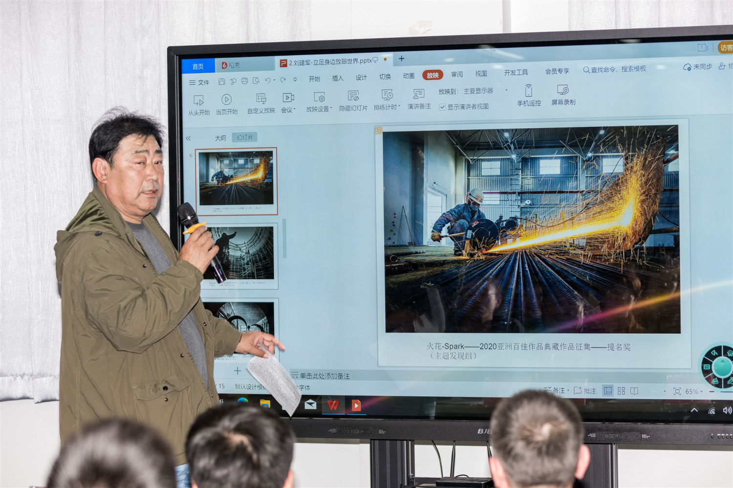 趙永祥采用影像與敘事相結合的方式,通過他攝影鏡頭記錄下的自然風光,全方位展示了房山區地理風貌和生態變遷。北京市第三高峰百花山、上方山、天方塔、葡萄酒莊等多幅攝影作品,將光與影、天與地、房與山、人與自然的關系表現得淋漓盡致。劉建軍通過“工業感”十足的紀實攝影作品,為同學們展示了燕山石化工業園區內的工作場景,以點帶面呈現了科技房山的精彩樣貌。劉老師的攝影作品注重光影和線條的配合,讓與會同學深刻理解了影視作品記錄社會變遷的重要功能。