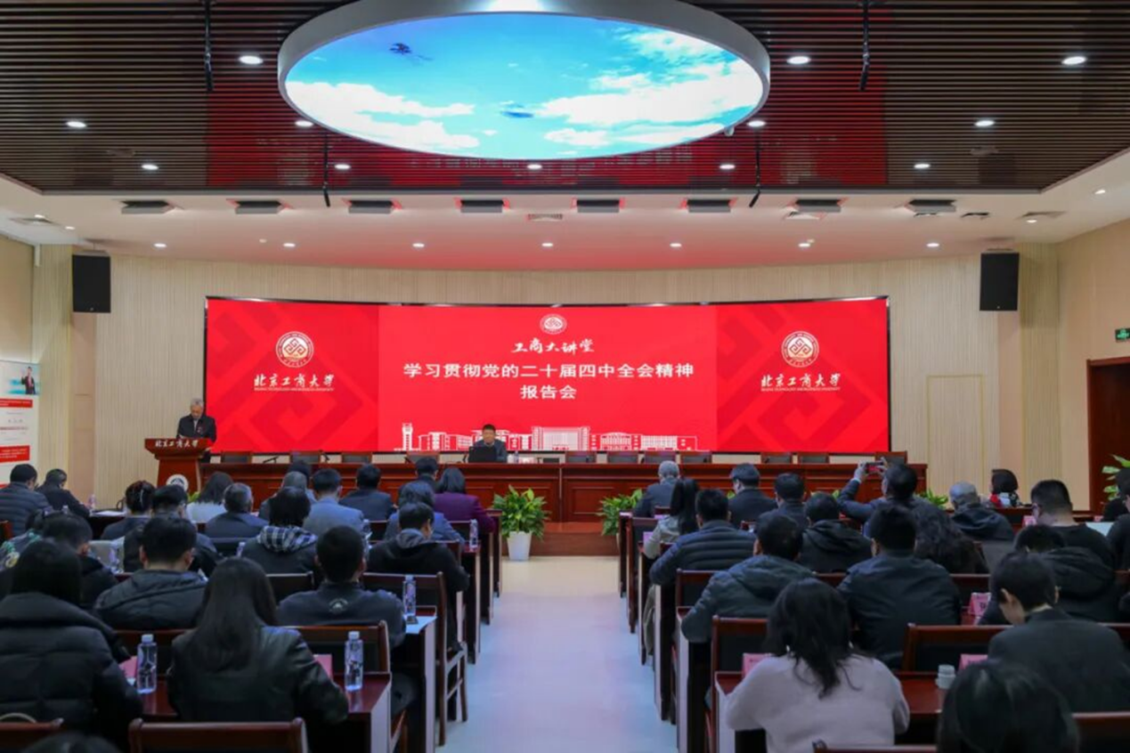 10月29日,學校在良鄉校區舉辦“工商大講堂”學習宣傳黨的二十屆四中全會精神報告會。清華大學教育學院李立國教授作題為《教育強國與高等教育高質量發展》的專題輔導報告。校領導沈千帆、郭建華、李中奇、宋曉欣、楊紅、毛新述出席會議。中層干部、教職工代表參會。各學院組織教師通過分會場線上觀看,實現兩校區多地聯動學習。報告會由學校黨委副書記李中奇主持。