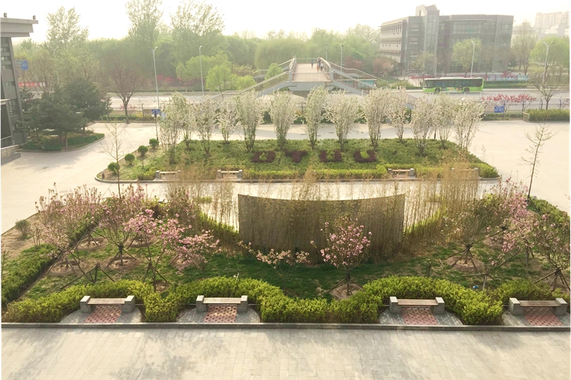 答:通過改造,書影疊翠景觀群實現了不同角度景觀不同,而又都圍繞書的主題。其中,圓弧形書墻宛如一冊打開的書,而自東向西看又像一冊合上的書。同時,在后期我們根據征求到的藝術與傳媒學院廣告學專業學生的建議,在南側種植黃楊、紫薇,站在過街天橋上看,書墻南北整體又宛似一冊我國傳統的線裝書,三葉草區域像裝訂區,黃楊球和紫薇如同裝訂線;而自南向北看,則像是一冊翻開的書,中間的道路則化為書脊。