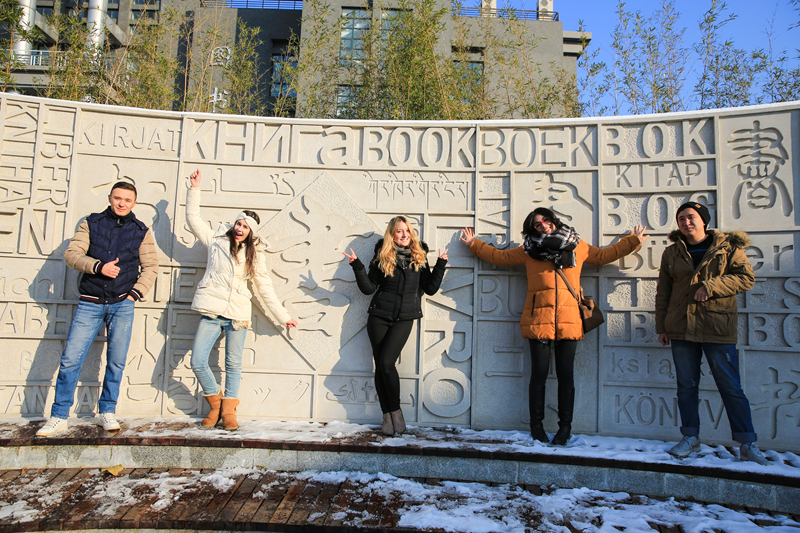 答:確實,這么多的文字收集起來很不容易,但是在全校師生的大力配合下,我們在獲取文字的同時,收獲更多的是感動。比如國際交流與合作處的劉影老師多次組織留學生將各自國家的“書”字,謄寫好交給我們參考;藝術與傳媒學院的鄭子云老師幾次專程到現場研究各種自然光線下墻體的整體色彩變化;外國語學院任玉芝老師更是在早班車上得知我們設計這一作品,施工階段還幾次提醒我們注意俄文最后一個字母的特殊寫法。