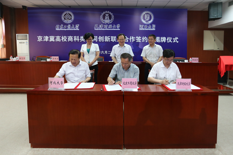 成立大會上,我校副校長謝志華、天津財(cái)經(jīng)大學(xué)校長李維安、河北大學(xué)黨委副書記王余丁聯(lián)合簽署了合作協(xié)議,譚向勇、李維安、王余丁共同為“京津冀高校商科類協(xié)同創(chuàng)新聯(lián)盟”揭牌。