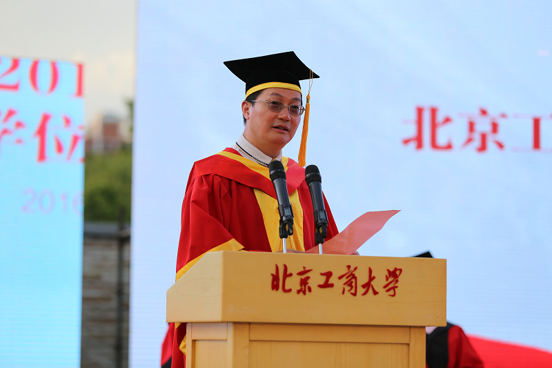 校長孫寶國院士在發言中,代表學校黨委和行政向圓滿完成學業的同學表示熱烈祝賀,向付出辛勤勞動的全體教職員工表示衷心感謝,向參加畢業典禮的家長致以誠摯問候。孫校長肯定了2016屆本科畢業生在學期間在學習、競賽、實踐等方面取得的喜人成績,并為同學們通過辛勤付出在就業、升學等方面取得的豐碩成果感到驕傲。他提到,2016屆畢業生中有27人次獲得國家獎學金,有302人次在各類競賽中獲得市級以上榮譽,有96人次獲得“校園之星”榮譽稱號,有24人被評為“北京市三好學生”,有135人被評為“北京市優秀畢業生”,有358名同學考上了北京大學、清華大學等單位的研究生,有317名同學出國深造,有12名同學投筆從戎,有83名同學志愿到基層建設美麗鄉村。孫校長給畢業生們兩條贈言:第一,大學畢業意味著新的開始,只要同學們在今后的工作、學習中能夠認準目標、腳踏實地、持之以恒、堅忍不拔必定會出類拔萃。孫校長還以近兩年我校國家英語四級考試排名和中國大學本科畢業生薪酬排名不斷上升為例勉勵大家積極進取,成為北工商的驕傲!第二,希望同學們今后凡事先替別人、替單位、替國家和社會想一想,先天下之憂而憂,后天下之樂而樂。孫校長談到,今年學校啟動了校友值年返校活動,希望再過10年,看到2016屆畢業生返校時的英姿和學校新的風采。希望大家共同努力打造北工商和北工商校友明天的輝煌!母校也將永遠惦記著大家,并為大家祝福!