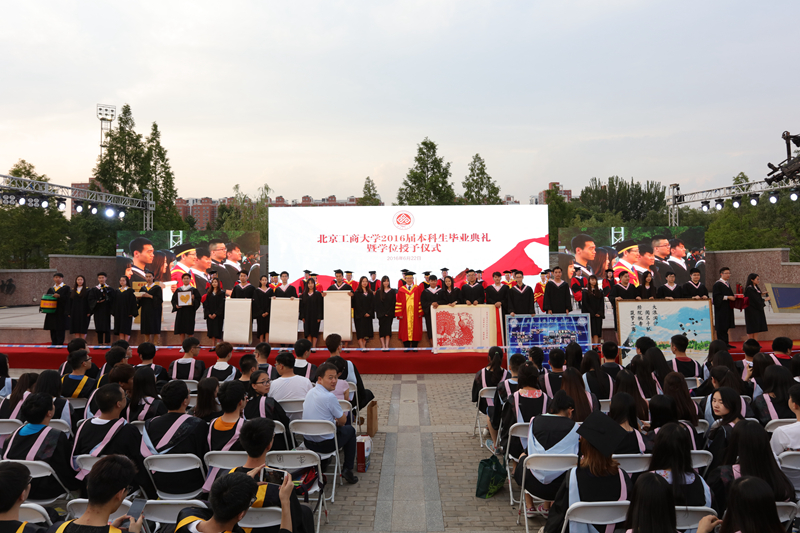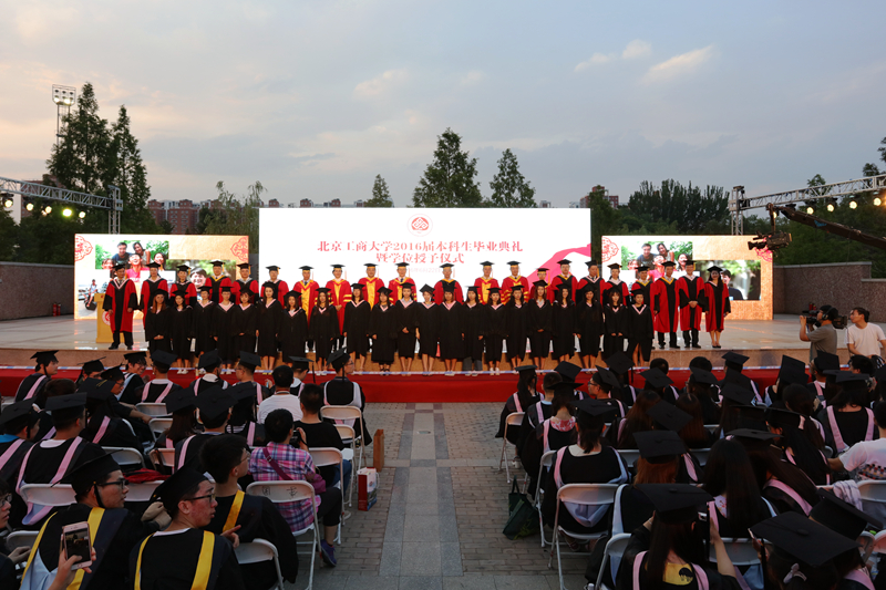 副校長李朝鮮宣讀了《北京工商大學關于2016屆本科生畢業及學士學位授予的決定》,黨委副書記董竹娟宣讀了《北京工商大學關于表彰2016屆優秀本科畢業生的決定》。今年,我校共有2743名本科生完成全部課程,總計授予2653名本科生學士學位,授予118名本科畢業生“北京工商大學優秀畢業生”榮譽稱號,另有135名本科畢業生榮獲“北京市優秀畢業生”。