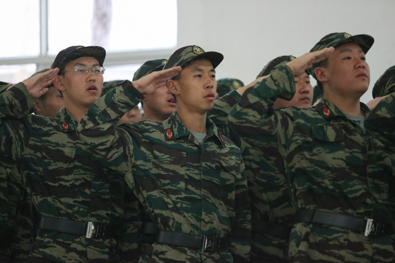 無論是教官還是隊員都非常重視這兩場比賽,每個連參加比賽的同學都是從自己的連隊里挑選出來的精英,他們是各連風貌的代表。大家無懼惡劣的天氣,跟隨教官在樓道里加緊訓練,并努力把動作做到位,整齊劃一。由于天氣原因,會操表演和歌詠表演都是在室內舉行的。雖然地面有水,有些滑,但教官和老師們根據場地減去了一些腳步的動作。比賽之際雨下得很大,但再大的雨也無法消磨同學們的積極應戰。同學們自信的步伐、整齊的隊列、快速的反應、標準的動作和洪亮的口號,展現了初步訓練的成果,也一次次贏得了場下同學的掌聲。而歌詠比賽,大家也都精神抖擻、神采飛揚,嘹亮的歌聲響徹全場,動人的演繹展現了同學們對軍人的敬意。經濟學院的王雪菲談到:“那天下雨大家都解散了,后來雨小了點,我們隊列班的又出來訓練,雖然很辛苦,但是努力還是有回報的。感覺很有成就感。”