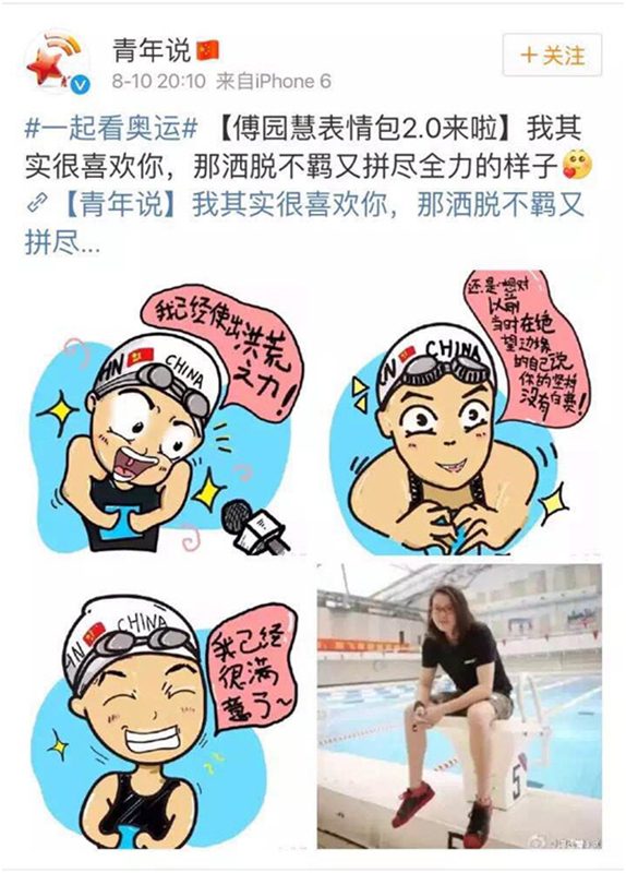里約奧運(yùn)會上,中國游泳健將傅園慧成為國人津津樂道的人物,與之相關(guān)的“表情包”在互聯(lián)網(wǎng)廣為傳播。共青團(tuán)北京市委員會官方微博及公眾號“青年說”,也于第一時(shí)間推出了一組卡通版的傅園慧表情包,得到了網(wǎng)友大量轉(zhuǎn)發(fā)與點(diǎn)贊。這些表情包就出自我校藝術(shù)與傳媒學(xué)院2014級5位學(xué)生之手。除了傅園慧卡通表情,他們的設(shè)計(jì)創(chuàng)業(yè)團(tuán)隊(duì)“北京兔兒爺設(shè)計(jì)工作室”還為共青團(tuán)北京市委員會設(shè)計(jì)了其他奧運(yùn)健兒的卡通表情,同樣受到了廣泛關(guān)注與好評。