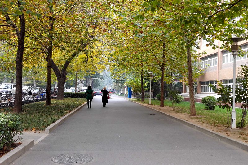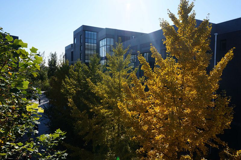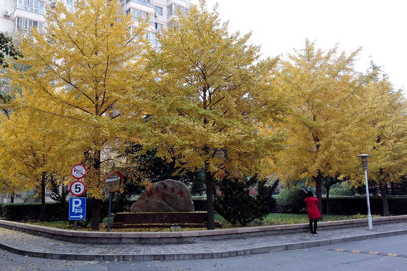銀杏,落葉喬木,是我國獨有的庭茵樹種,也是世界上最古老的孑遺植物。銀杏樹高大挺拔,氣勢非凡,是我國最主要的秋季觀賞樹木。銀杏枝葉輻射狀散生,葉扇形,夏季呈翠綠色,初秋是黃綠色,落葉前變成了金黃色。我校的銀杏樹主要位于阜成路校區綜合樓附近的道路兩側,共計29棵,良鄉校區銀杏共有132棵,以文二樓樓宇之間的道路兩側銀杏為佳。這兩處的銀杏樹樹齡較長,枝葉繁盛,形成了極好的銀杏道景觀。陽光正好的秋日,漫步在金黃漫地的銀杏道上,抬頭望去,那目光所及的燦燦金黃與湛藍的天空相映成輝,總能帶給人一種歲月靜好,時光荏苒的沉靜之美。