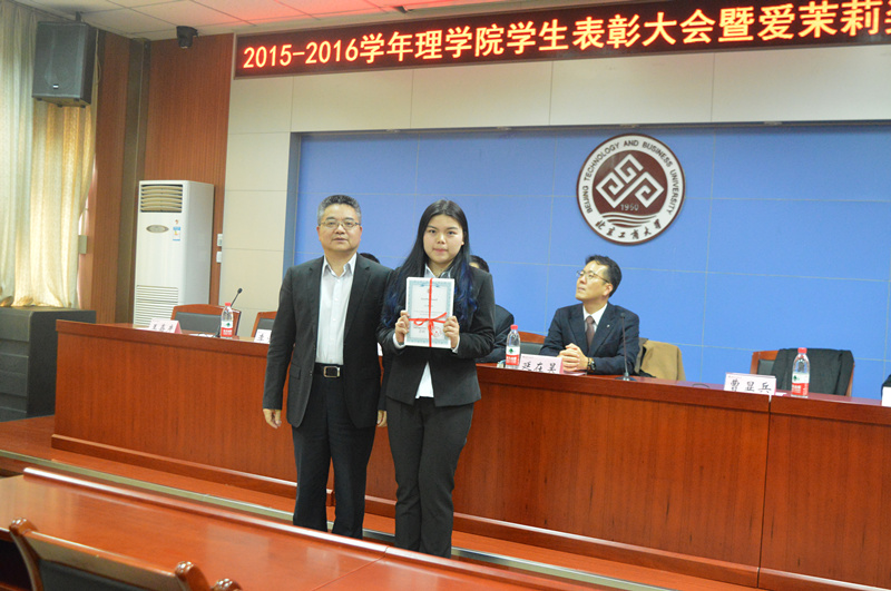 祝鈞宣讀了關(guān)于表彰2015-2016學(xué)年學(xué)生先進(jìn)集體、先進(jìn)個人及優(yōu)秀學(xué)生獎學(xué)金獲得者的決定,學(xué)院領(lǐng)導(dǎo)為獲獎同學(xué)頒獎。獲得國家獎學(xué)金的葉蘋同學(xué)代表發(fā)言,她感謝學(xué)校和學(xué)院給予自己的榮譽,向同學(xué)們介紹了自己的學(xué)習(xí)方法及經(jīng)驗,并表示會加倍努力、回報社會。延在昊為獲得“愛茉莉”獎學(xué)金的同學(xué)頒獎,并表達(dá)了對同學(xué)們的美好期望。獲獎學(xué)生送上了親手制作的精美禮物,以表達(dá)他們對“愛茉莉”公司的感謝。