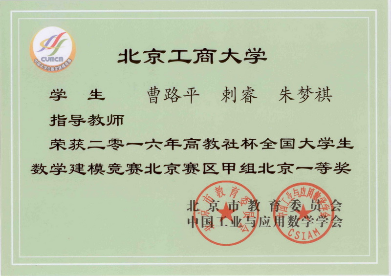 日前,2016年全國大學(xué)生數(shù)學(xué)建模競賽獲獎名單公布,我校32支參賽隊(duì)伍經(jīng)過緊張奮戰(zhàn),最終獲得了全國二等獎1項(xiàng)、北京市一等獎1項(xiàng)、北京市二等獎2項(xiàng),成功參賽獎28項(xiàng)。來自經(jīng)濟(jì)學(xué)院金融工程142班的郭子沛、張?zhí)鹛鸷忘S翔團(tuán)隊(duì),經(jīng)專家評審、現(xiàn)場答辯后脫穎而出,進(jìn)入全國會評,最終獲得全國二等獎。這也是我校學(xué)子再次獲得數(shù)學(xué)建模國家級獎項(xiàng)。