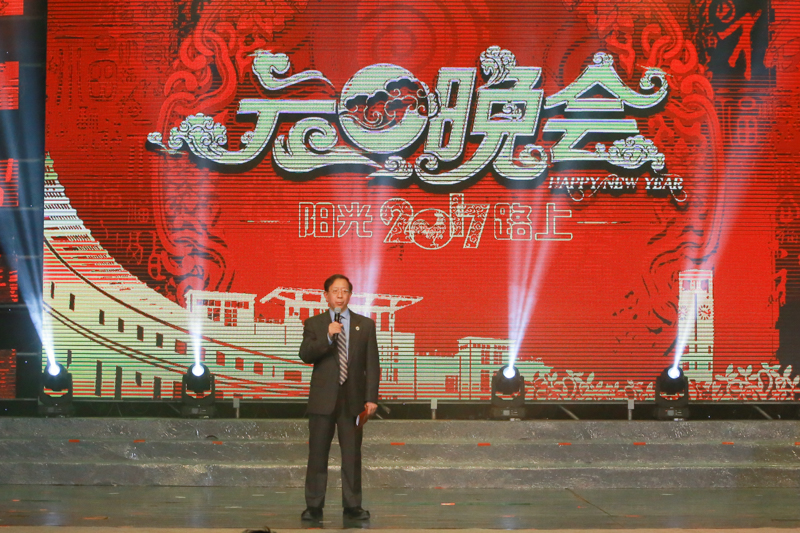 校長孫寶國院士在致辭中表示,今晚文體館燈火輝煌,群情激昂,大家歡聚一堂共同迎接2017年。他代表學校黨委和行政對2016年辛勤工作的各位教職員工、勤奮學習的各位同學表示親切的慰問,向關心學校發展的各位離退休老同志、各位領導、各位朋友和全體校友表示衷心的感謝!孫校長表示,2016年在大家共同的努力下,學校在一流大學、一流學科建設的征程上邁出了堅實的第一步,今天的節目非常精彩,節目編排充滿著對學校的真情。他即興將晚會的節目單編寫成詩作為祝福送給在場觀眾:“咱們都是工商的兵,和你一樣我愛北工商!北工商的日子,月下低語,青春舞曲,聲律啟蒙,青春夢響!陽光路上,田野在召喚,搖滾卡農中國鼓,友誼地久天長!”