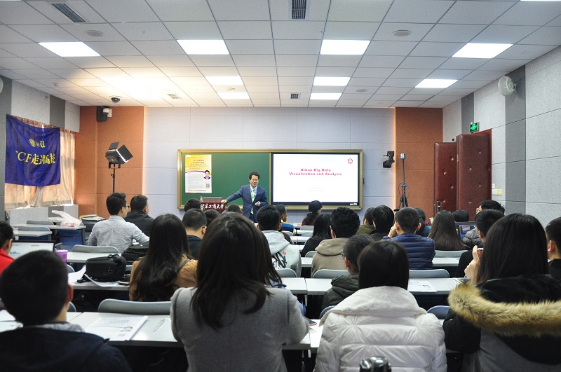 報告會全部用英文進行,還通過手機網絡平臺進行了直播。在講座中,袁曉如教授介紹了在現代社會大數據處理和分析的困難性,以及可視化方法對公眾和決策者的重要性。袁教授系統的介紹了其團隊在城市交通數據可視化方面的多個案例,其使用的數據集包括出租車GPS、RFID記錄、IC卡、手機信號和社交媒體數據。通過合理的可視化手段,專家可以進行交互式的數據探索工作。通過袁曉如教授圖文并茂、耐心細致的講解,多種城市交通可視化方法的思路、布局、方法、結論一一展現在聽者面前。隨后袁教授還講解了大數據分析在當前社會環境下的重要意義。