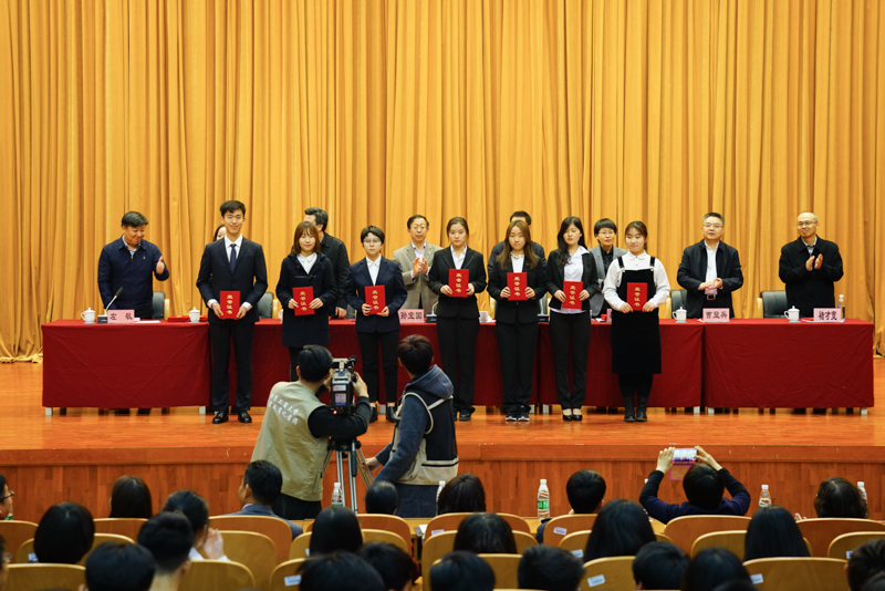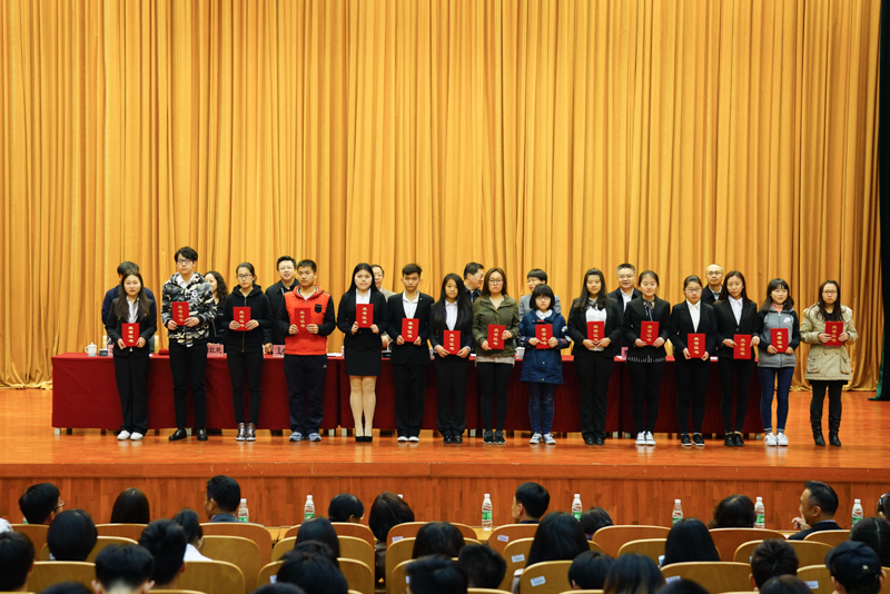 副校長李朝鮮宣讀了《北京工商大學關于表彰2016年12月份全國大學英語四六級考試成績優(yōu)異學生及2016年秋數(shù)學競賽獲獎學生的決定》。此次學校表彰了114名大學英語四六級考試成績優(yōu)異的學生,其中英語四級一等獎7人、二等獎15人、三等獎25人、優(yōu)秀獎64人,英語六級優(yōu)秀獎3人;表彰了25名在美國大學生數(shù)學建模競賽、國家大學生數(shù)學建模競賽、國家大學生數(shù)學競賽中獲獎的學生;還表彰了90名在校內(nèi)數(shù)學競賽中獲獎的學生。在師生們的掌聲中,獲獎學生分別上臺領獎并與頒獎的領導、老師合影留念。